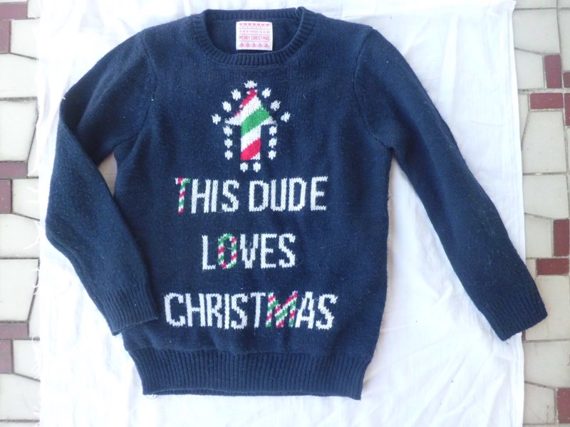 110-116-os sötétkék kötött karácsonyos pulcsi 600 ft