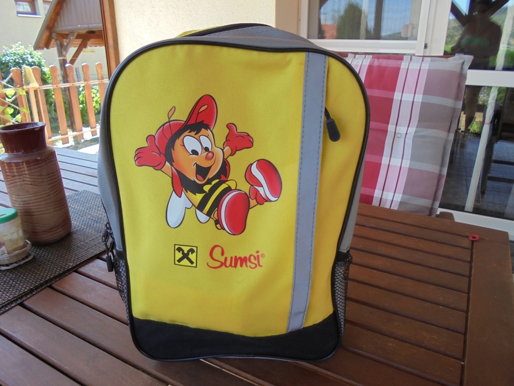 Újszerű méhecskés hátizsák kétoldalt italtartó hálóval, tetején cipzáros, elöl cipzáros zseb- 35 x 25 x 9 cm-es 800 ft