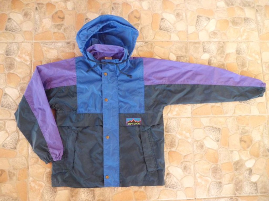 134-140-es Captain eső-szél-túrakabát. Kapucni elrejthető, ujja gumis, cipzáros zsebek. H. 54, sz. 44, ujja 60 cm. 1000 ft